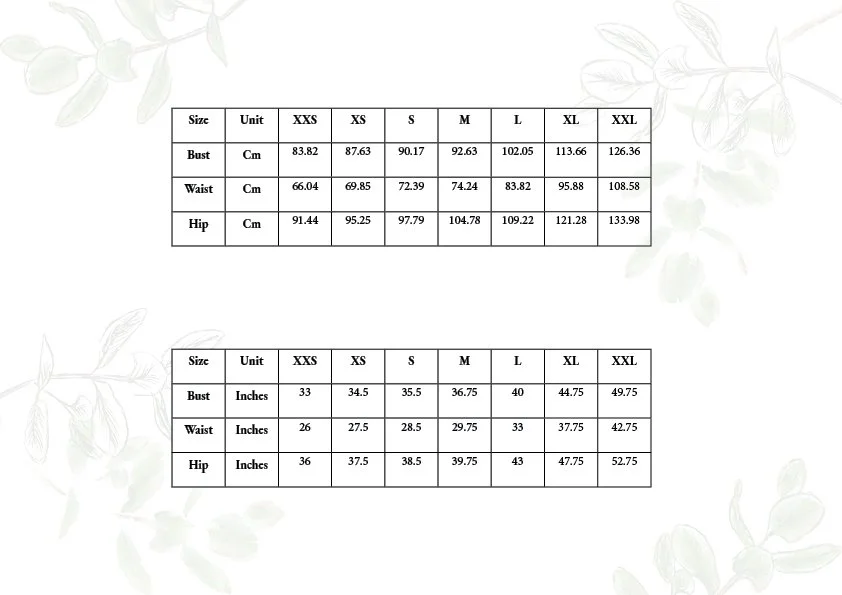 We offer a standard size range from UK Size 4 to 24 (XXS to XXL), with measurements for bust, waist, and hips provided in both centimeters (cm) and inches (in), so you can choose your preferred metric.